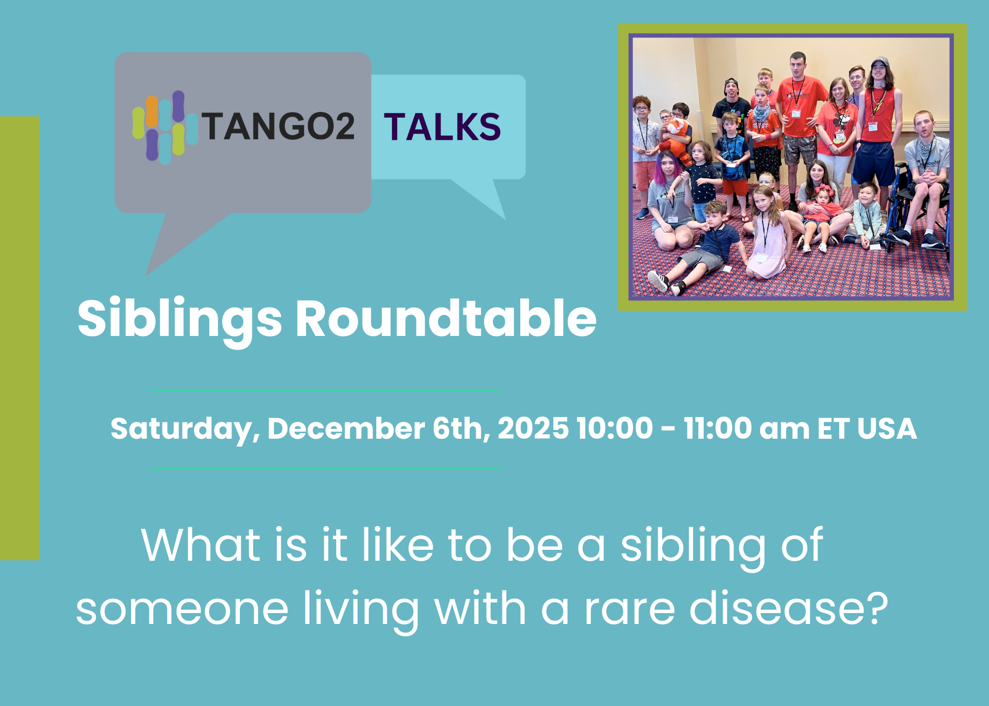Siblings play a special and powerful role in the lives of our TANGO2 warriors. They share in the daily experiences, challenges, and joys that shape family life with TANGO2. We invite all members of our community — parents, caregivers, siblings, and loved ones — to join us for an open conversation as we listen to sibling voices, learn from their unique perspectives, and explore ways to support them as an essential part of the TANGO2 community.